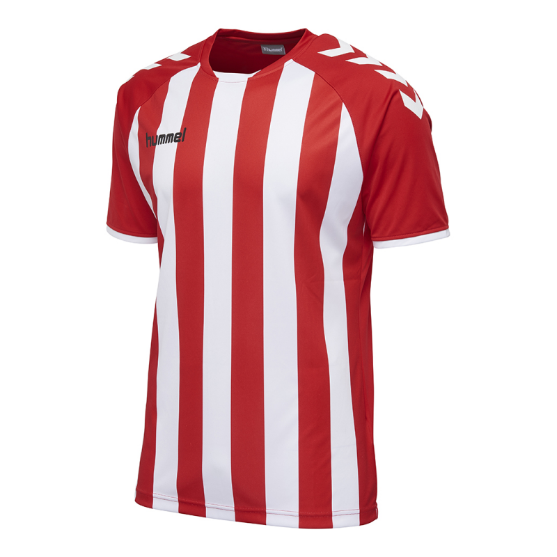Striped Core SS jersey classic look the hummel® shirt is all about comfort on the field. This jersey features printed chevrons on the shoulders round neck Inside of the neck is taped for comfort. Slim fit and raglan sleeves provide a streamlined look. Ribbed fabric on the sleeves flexes for a close fit available in 7 colours. This style can be printed and embroidered to the specifications of the manufacturers. We can offer a very turn round on this shirt.