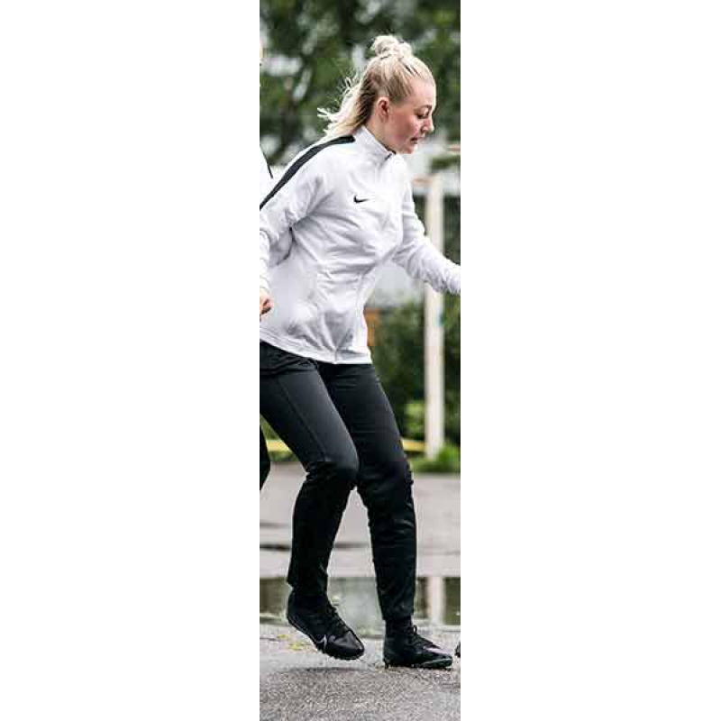 Nike women’s Academy 18 knit Tech pants will match the above jacket. All conditions tapered fast pant in Dri-FIT knit fabrication with zipped pockets. Iconic football DNA fast side stripe in cut & sew execution. Elastic waistband with a contrast inner mesh fabric and draw cord for a strong visual aesthetic. Leg zippers at hem for easy on and off. Contrasting color stitch on inside for extra visual appeal. Embroidered Swoosh design trademark.