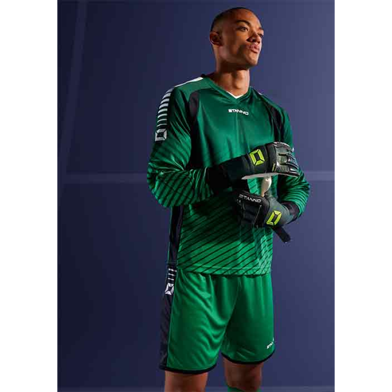 Clima TechStanno Blitz Goalkeeper set is sold as a jersey & shorts together which a colour coordinated. The Blitz goalkeeper set has sublimated stripe print on the shirt, the elbows have protective padding. The matching shorts have an inner and an elastic waistband with drawstring. Climatec finish for optimum moisture removal.
